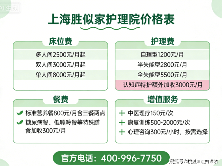 护理院采用“床位费+护理费+餐费+增值服务”复合模式,月均费用区间为3000元至18000元: