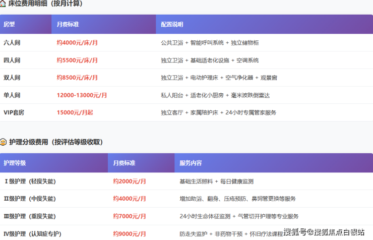 双人间:约8500元/床/月,通常配备电动护理床、观景窗及空气净化器,提升居住舒适度。