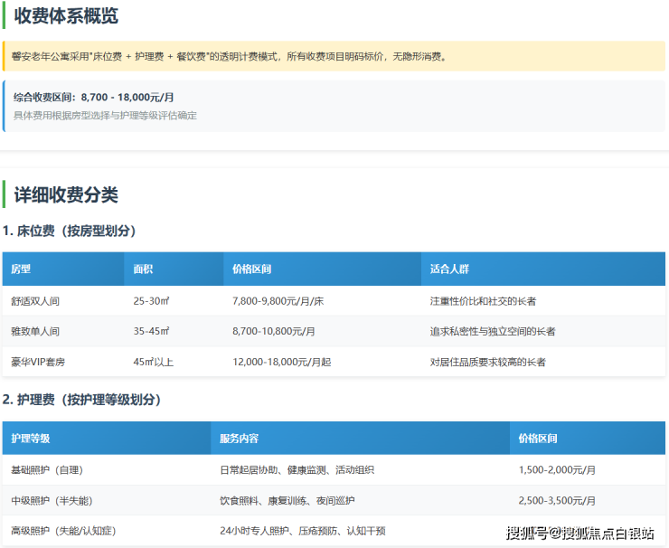 整体月费区间为8700-18000元/月(床位费+护理费+餐费)。最精确的个性化报价需通过电话400-855-0290咨询,由专业顾问结合长者具体健康状况、所选房型及楼层朝向等因素评估后确定。