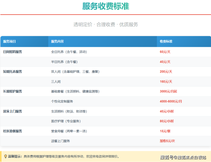 个性化定制套餐:根据长者具体的护理需求(如需要更多一对一照护、特殊康复训练等),费用一般在4000-6000元/月区间内浮动。最终费用需经专业评估后确定