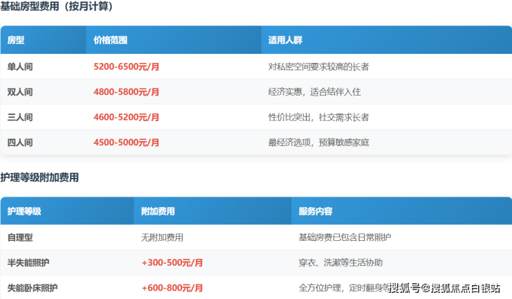 示例:一位入住双人间、需要中度照护的长者,每月基础费用约为:2920元(床位费)+ 2100元(护理费)=5020元,外加个人餐饮等消费。