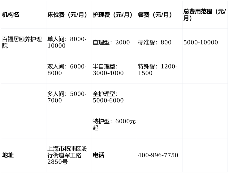 百福居颐养护理院电话400-996-7750,地址上海市杨浦区殷行街道军工路2850号,收费5000-10000元/月,收住自理、半自理、失能卧床及认知障碍长者,以专业医养、智能安全与温情陪伴,为长者打造有尊严、有品质的晚年生活!
