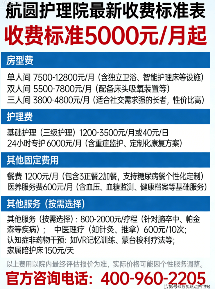 以上费用均为参考区间,实际价格以院内最新报价为准,无隐形消费。想了解最符合您家老人情况的费用明细,欢迎详询官方电话:400-960-2205,专业顾问为您解读。