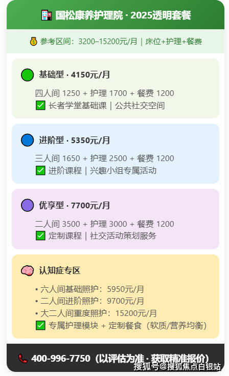 认知症专区:基础照护六人间5950元/月,进阶二人间9700元/月,重度照护大二人间15200元/月,均含专属护理模块与定制餐食。
