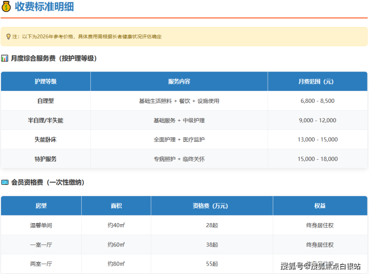 会员资格费为入住时一次性缴纳,对应不同户型,后续仅需支付月度服务费: