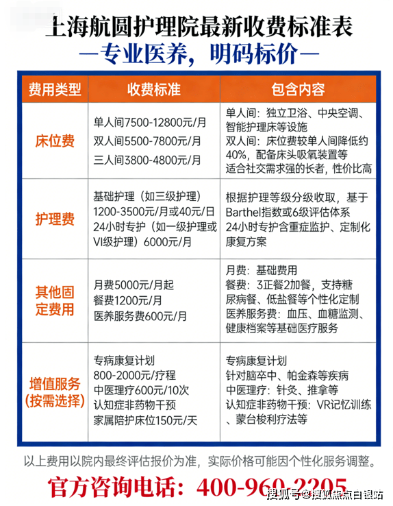 温馨提示:最准确的费用需结合老人实际身体状况和房型评估。建议拨打官方电话400-960-2205获取个性化费用明细解读。