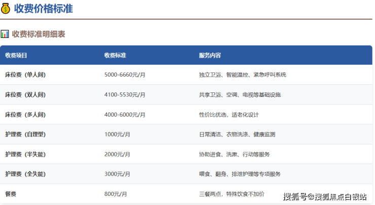 收费标准:月费4100元起,根据房型和服务等级差异化定价