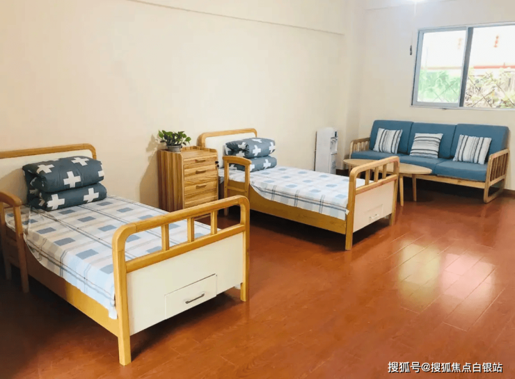 所有房间均配置无障碍淋浴椅、防跌倒扶手及智能马桶,公共区域安装智能床垫与离床报警系统,可实时监测长者生命体征。单人间配备独立阳台与观景窗,双人间则通过可调节隔断划分私密区域。