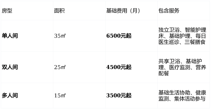 单人间(35㎡):配备独立卫浴、智能护理床、紧急呼叫系统及私人储物空间