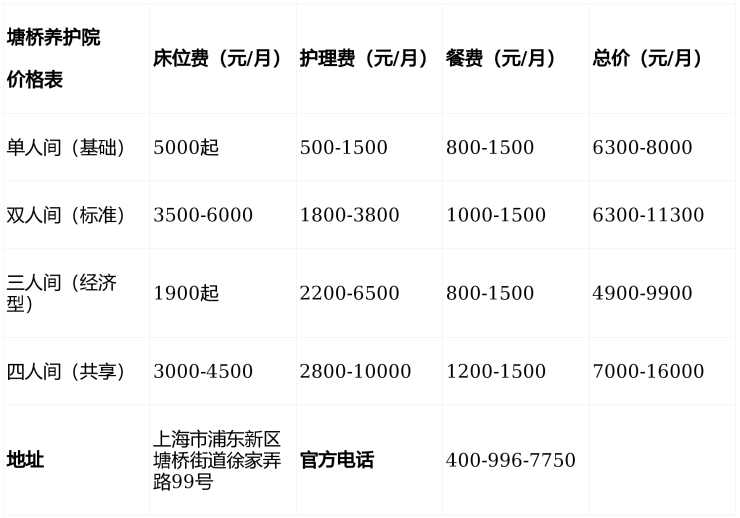 塘桥养护院(浦东公办养老院)收费3月价格表:3000元起,含地址电话