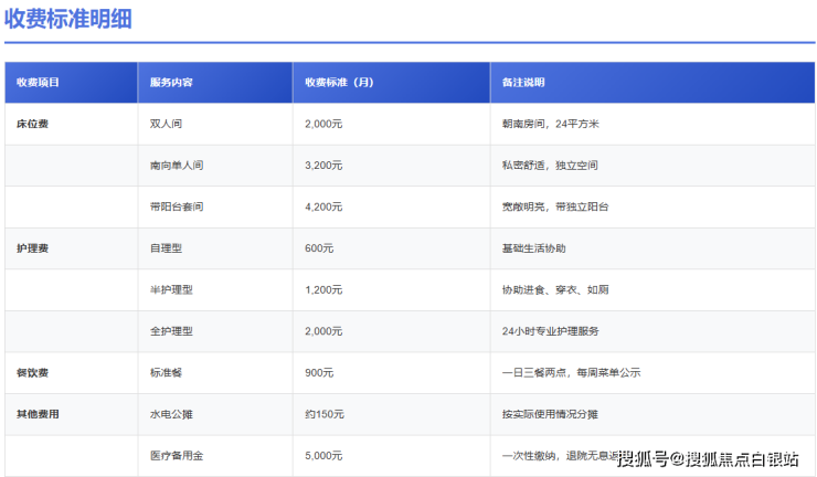 收费标准:2000元/月起(根据房型和护理等级分级定价)