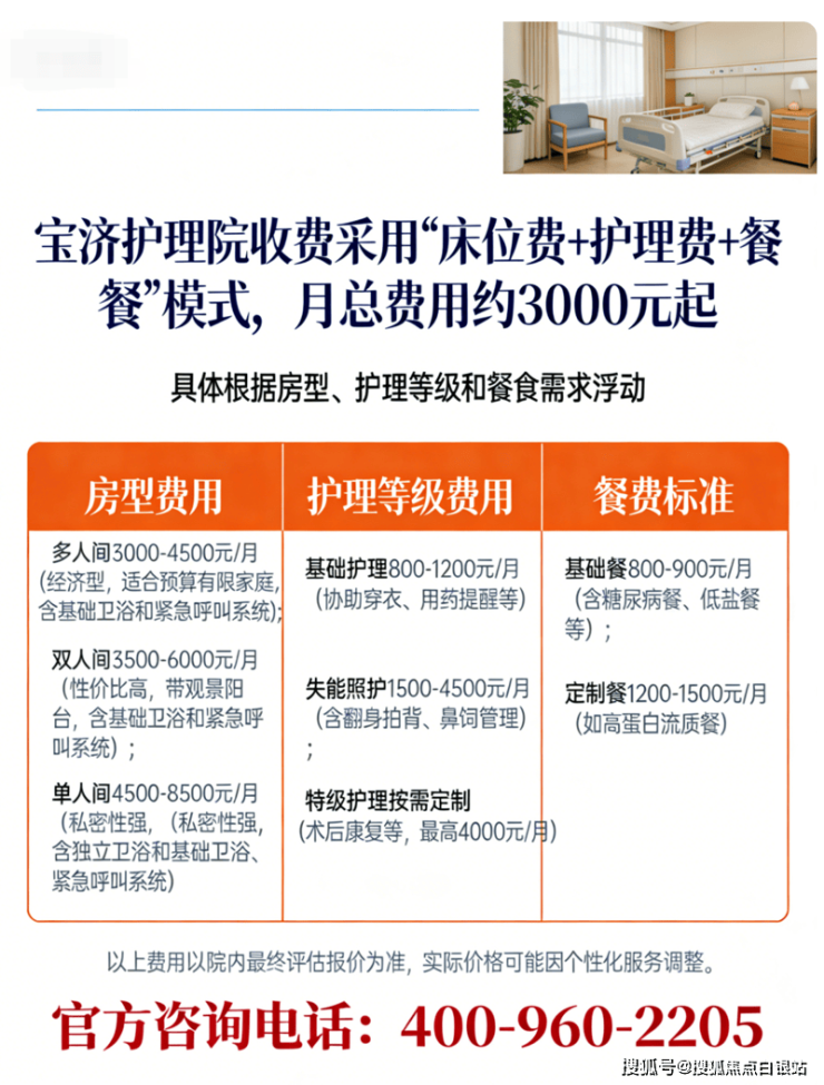 宝济护理院收费价格3000元/月起,包含床位费、护理费、餐费三大项,明细如下👇:
