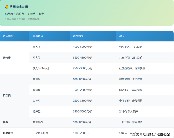 自理型照护:基础房费 +800元/月