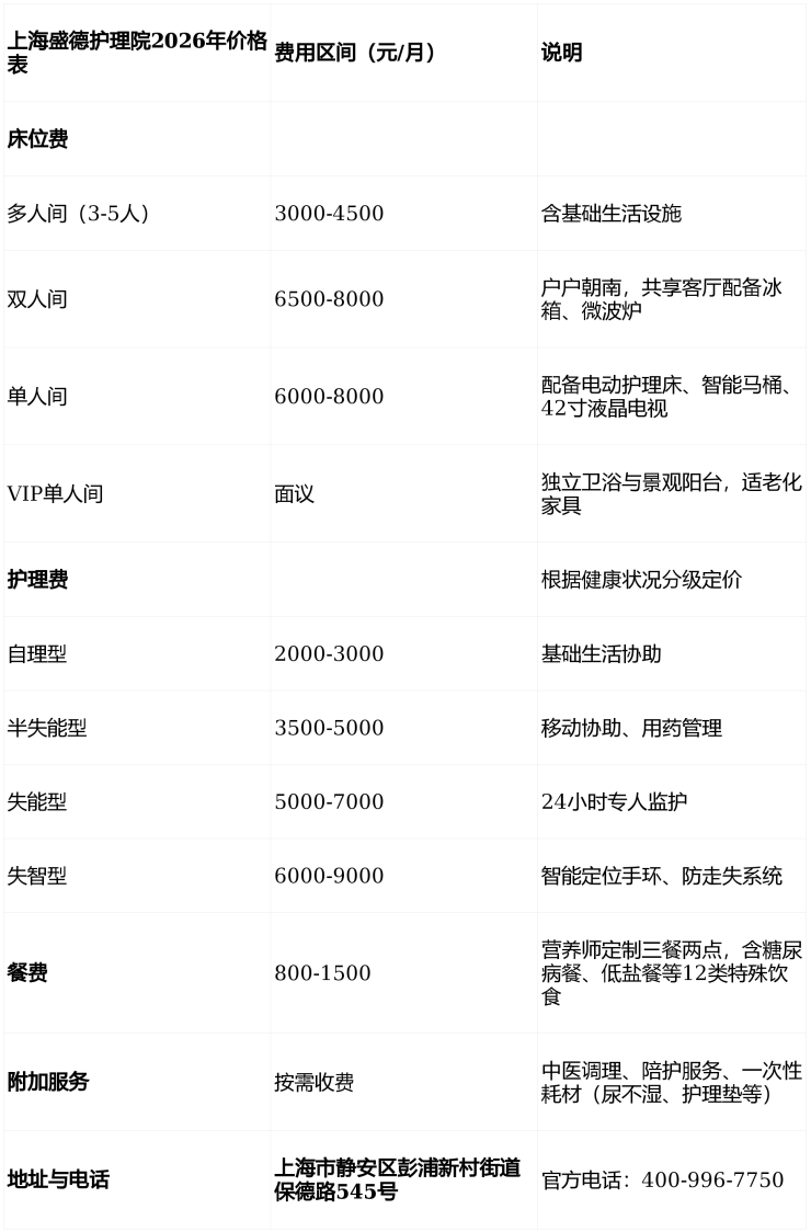 保德路545号盛德静安护理院2026收费标准:每月3000元起,地址电话全解析