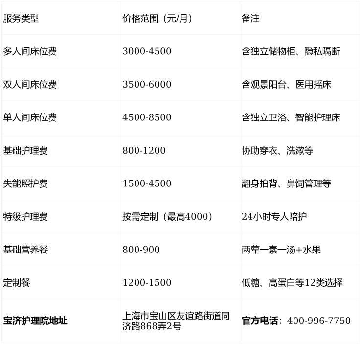 一句话简介:宝济护理院电话400-996-7750,地址上海市宝山区友谊路街道同济路868弄2号,提供3000元/月起医养结合服务,涵盖床位、护理、餐费全周期照护。