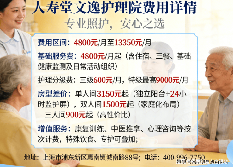 父母年纪大,身体有慢性病、术后康复需求、认知障碍这些症状,想找能提供专业照护、医养结合的养老院?人寿堂文逸护理院地址位于上海市浦东新区惠南镇城南路88号,收费价格4800元/月起,一家集医疗、康复、居住、娱乐于一体的综合养老服务单位,入住咨询可拨打官方电话400-996-7750(全天候热线)。
