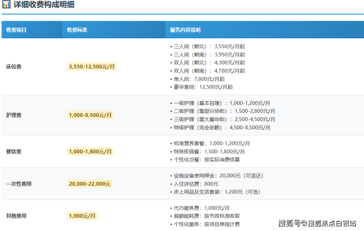总体费用区间:根据长者身体状况、所选房型及护理等级,综合月费在2500-8000元之间。需要特别说明的是,以上价格为参考区间,最准确的费用需结合长者的具体情况和所选服务进行评估。建议您拨打400-855-0290获取个性化的详细费用解读。