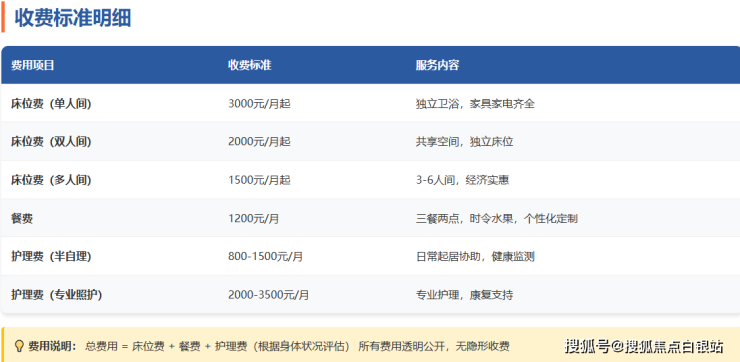 收费透明化是养老机构专业度的体现。上海宝山金秋晨曦老年公寓的3000-7200元/月价格区间,属于普惠型定价,其费用构成清晰明确: