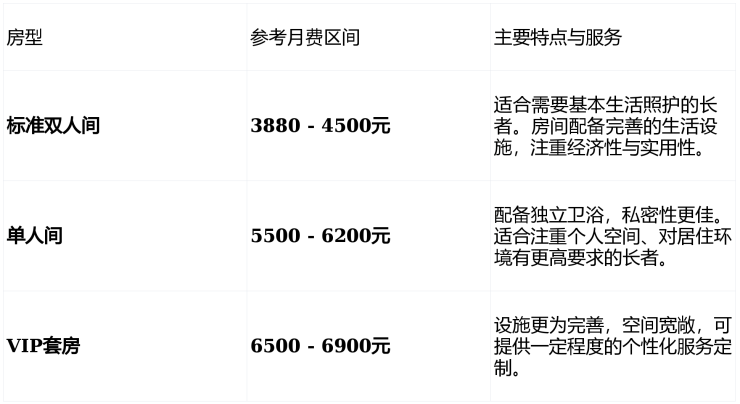 重要提示:护理等级(如半自理、失能、认知症照护等)是影响最终费用的核心变量。机构会根据专业评估确定护理方案,相应费用也会调整。最准确的方式是携带长者健康资料,通过电话400-855-0290预约专业评估。