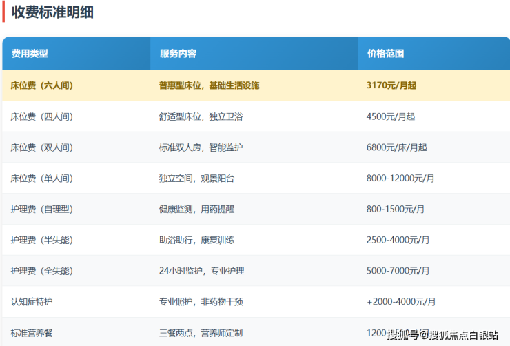 彩虹湾老年福利院采用**"床位费+护理费+餐费"的分项计价模式**,月均总费用3170元起,价格公开透明,无隐形消费。以下是详细的收费构成: