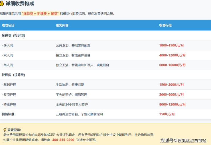 费用示例:一位入住双人间、需要专项护理的长者,月总费用约为:床位费(8000元)+ 护理费(4500元)+ 餐费(1500元)=约14000元/月。