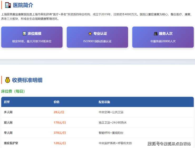 在收费方面,上海银美嘉宜康复医院采用分层透明的定价模式: