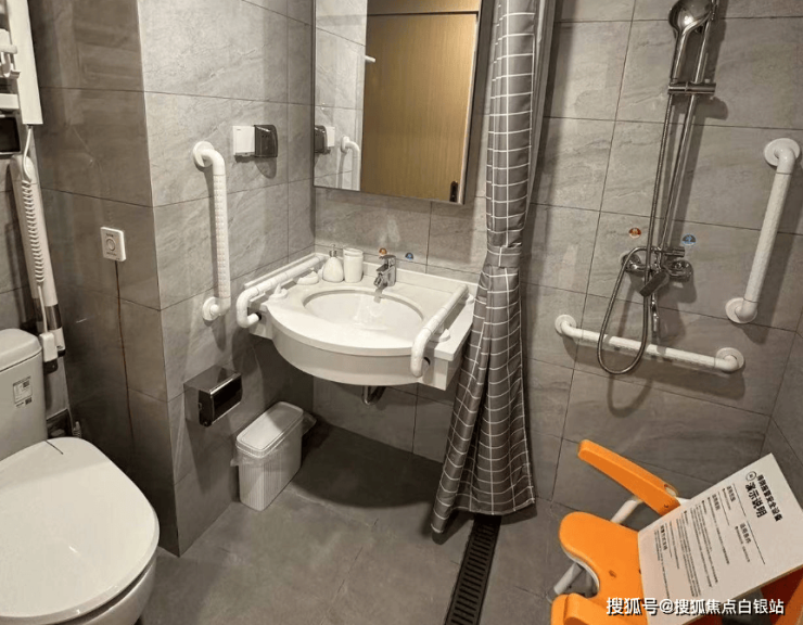 全楼防滑PVC地胶、2.4米宽走廊配双侧夜光扶手、卫生间恒温花洒+折叠助浴椅。