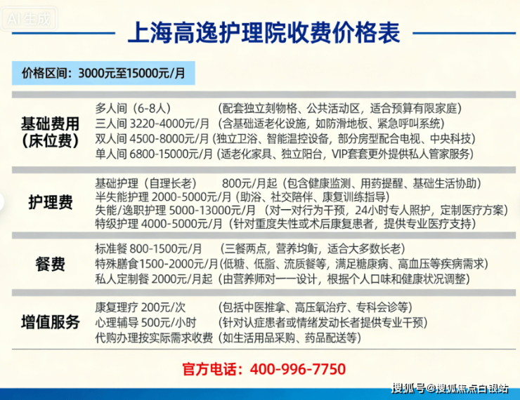 护理院采用“基础费用+分级护理+增值服务”复合模式,月均总费用区间为3000元至15000元,具体构成如下: