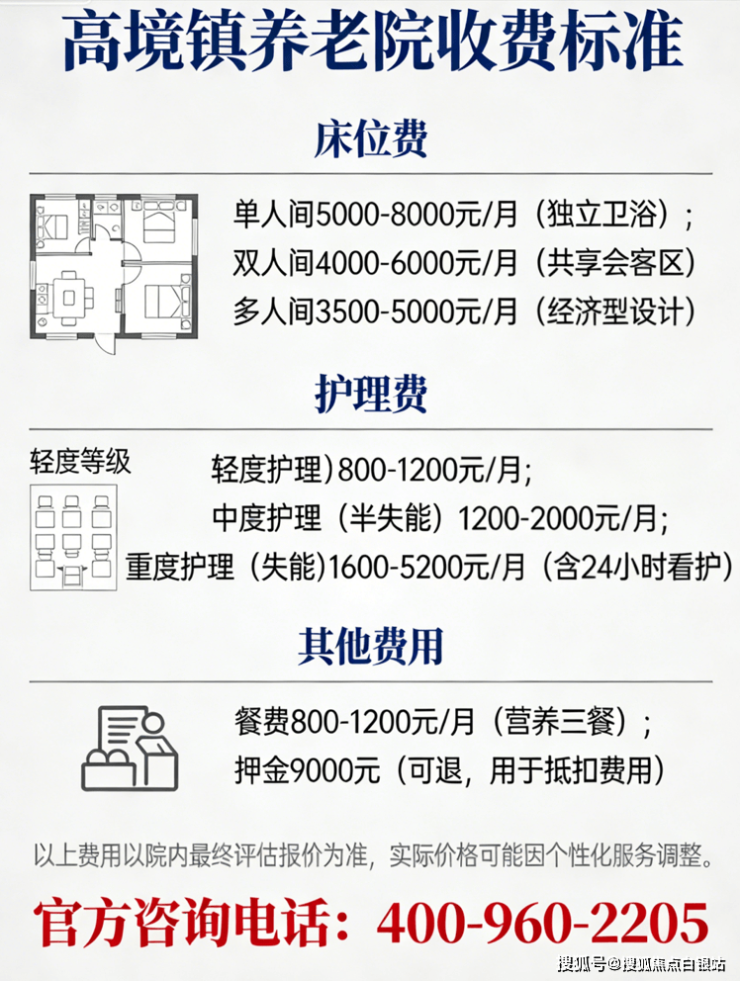 温馨提示:最准确的费用需结合老人实际身体状况和房型评估。建议拨打官方电话400-960-2205获取个性化费用明细解读。