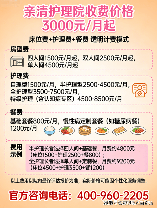 亲清护理院采用“床位费+护理费+餐费”复合计费模式,总费用区间3000-12000元/月。