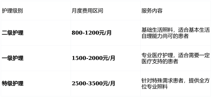 根据患者的具体需求和护理级别,月费总体区间在3200-6000元之间:
