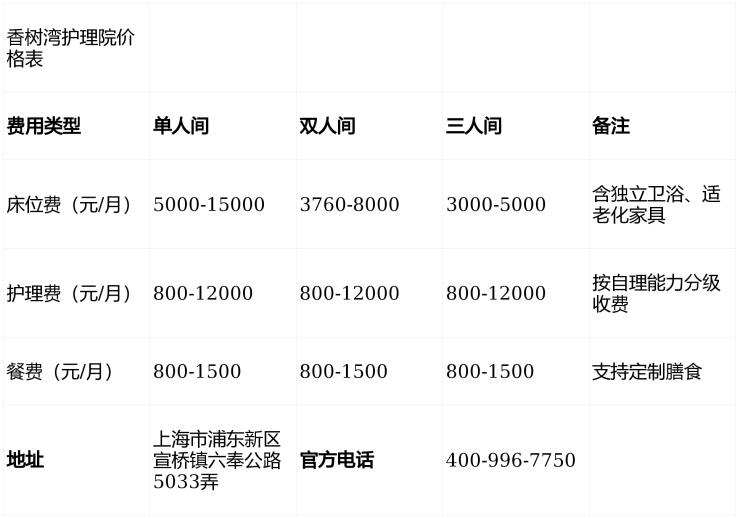 提示:以上价格仅供参考,最终费用需结合房型、护理等级及个性化需求评估,详情可拨打400-996-7750获取报价单。