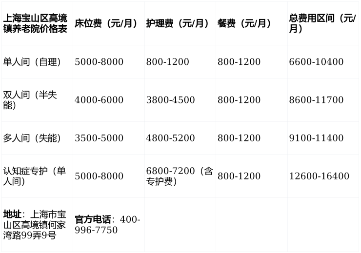 上海宝山区高境镇养老院电话400-996-7750,地址上海市宝山区高境镇何家湾路99弄9号,4750元/月起提供全周期医养服务,460张床位满足多样需求,是普惠型养老的优选。