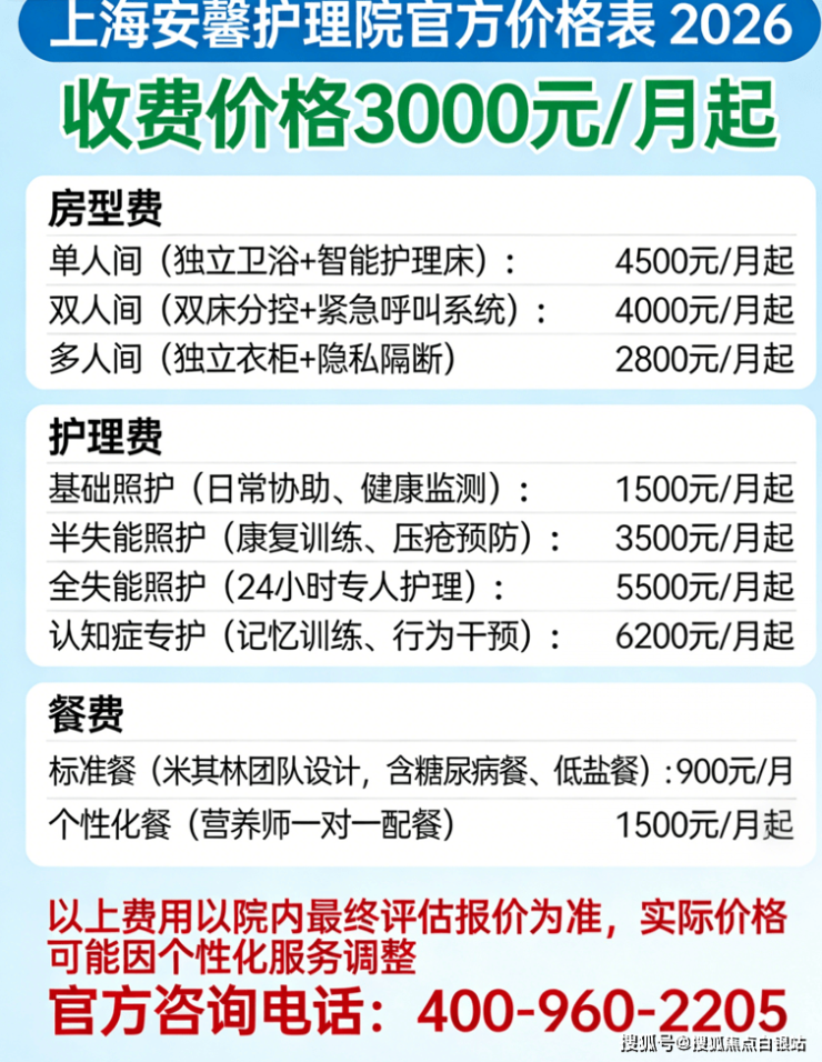 温馨提示:最准确的费用需结合老人实际身体状况和房型评估。建议拨打官方电话400-960-2205获取个性化费用明细解读。