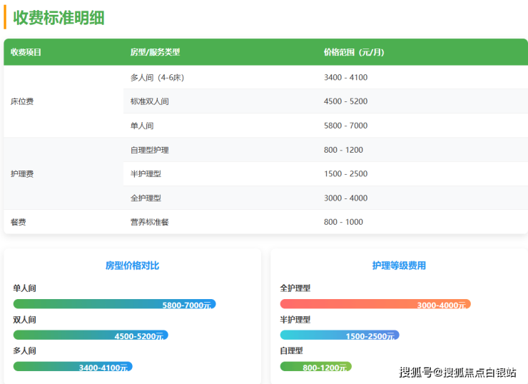 上海怡安养老院采用“床位费+护理费+餐费”的阶梯式定价模式,月均费用区间为3400元至6200元,具体如下: