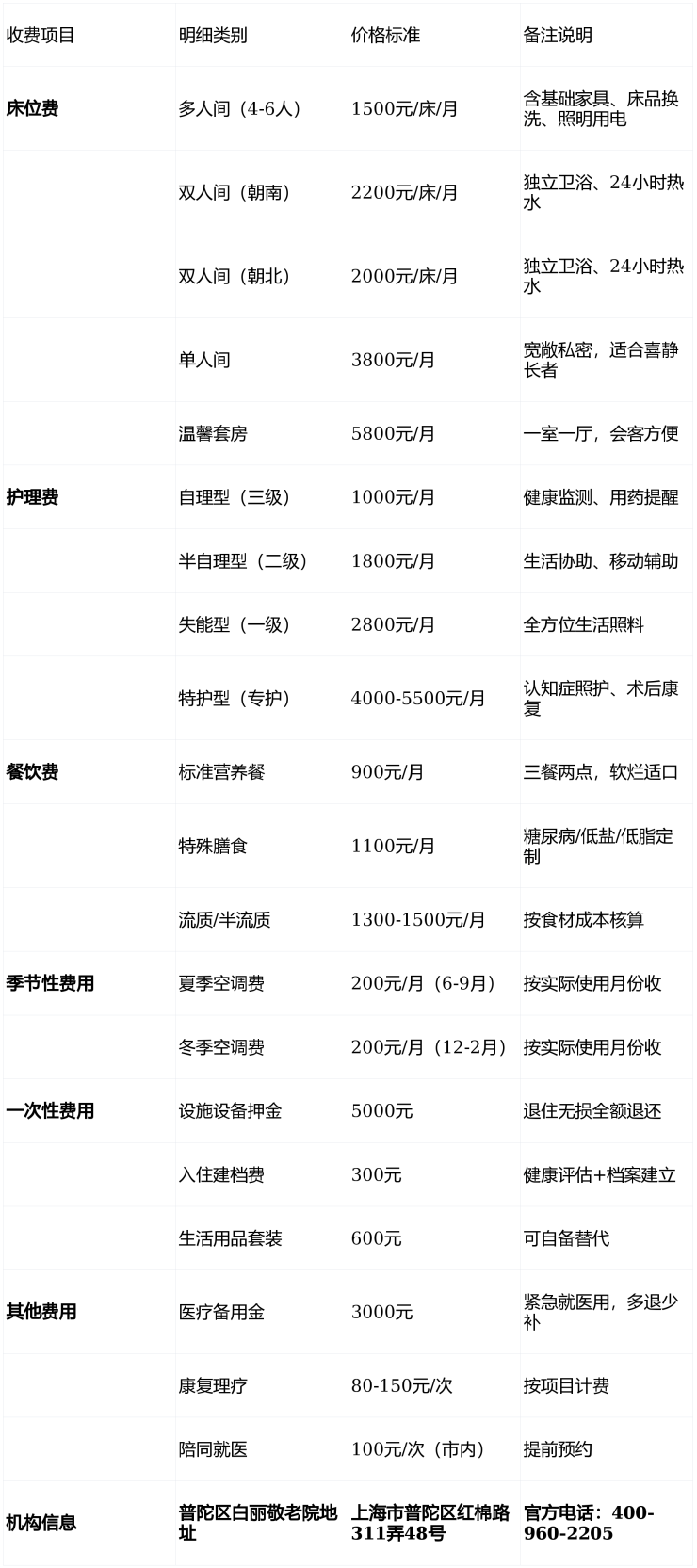 Q2:普陀区白丽敬老院收费标准具体怎么算?有没有隐藏费用?