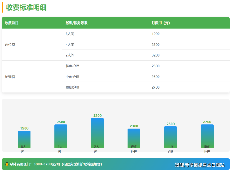 兰公馆采用“床位费+护理费+伙食费”的复合收费模式,月费区间为3800-6700元,具体构成如下: