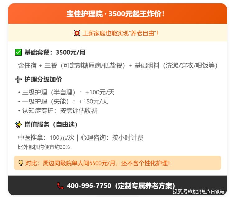 A: 打听了一圈发现,嘉定区普通养老院单人间普遍要5000元+/月,而宝佳直接甩出“3500元起”的王炸!更厉害的是它的“基础套餐+分级护理”模式: