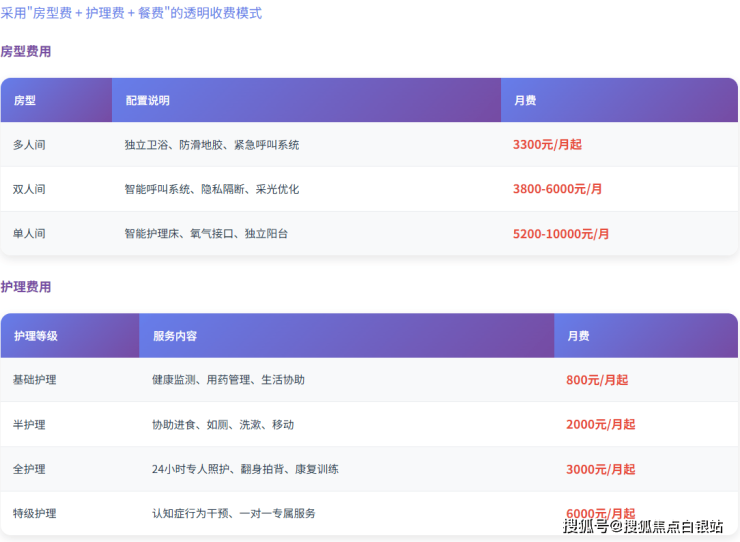 特级护理:6000元/月起。针对有复杂照护需求,如需要一对一专属服务或特殊行为干预的长者。