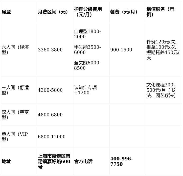 开业及发展:作为嘉定区首个“公建民营”医养结合项目,总投资3亿元,总建筑面积35203.29平方米,绿化面积超9000平方米,绿化率45%。依托人寿堂集团三十余年养老运营经验,已形成“医疗+康复+文化+生态”四位一体的服务模式,成为上海市医养结合标杆机构。