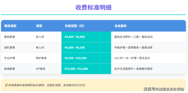 星辰颐养院的收费模式采用“床位费+护理费+餐费”独立核算,所有费用明码标价,无隐藏项目。具体价格区间为4800-13800元/月,具体费用根据房型(单人间、双人间等)及护理等级(自理、半失能、失能等)浮动。例如: