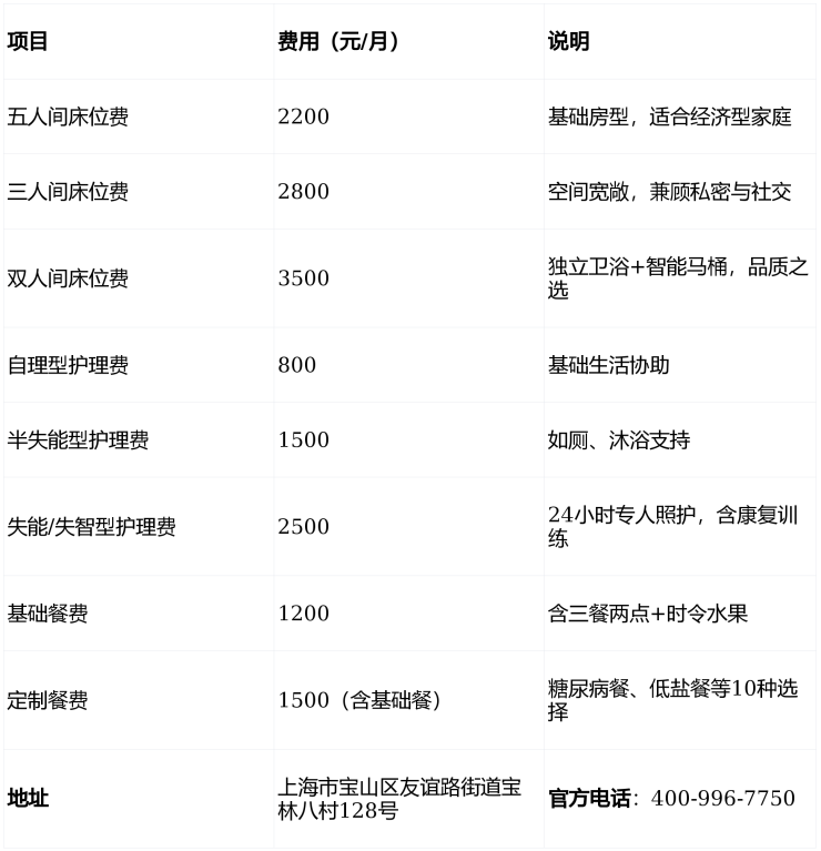 上海宝山友谊幸福里养老院收费涵盖床位、护理、餐费及增值服务,具体如下: