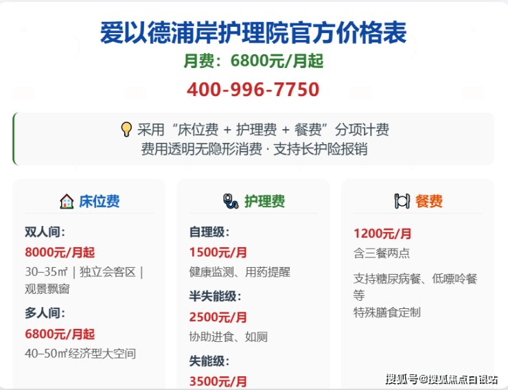 我们采用“床位费+护理费+餐费”模式,月费6800元起,具体如下: