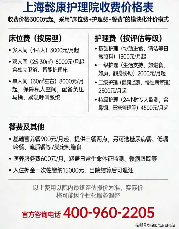 上海懿康护理院收费价格3000元起。采用“床位费+护理费+餐费”的模块化计价模式,