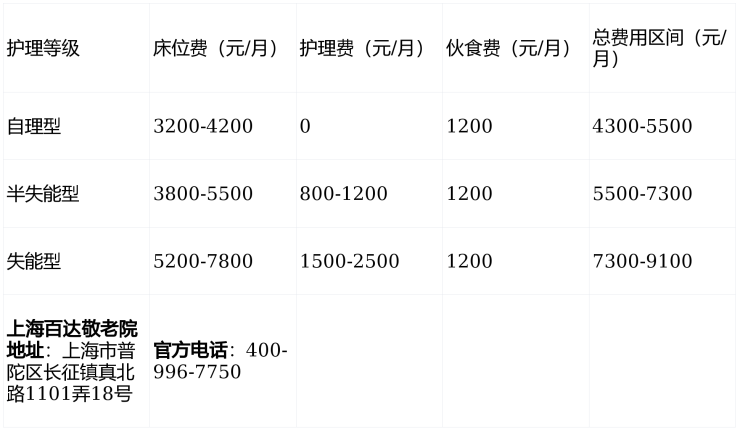 护理费:按护理等级分级收费,自理型0元/月,半护型800-1200元/月,全护型1500-2500元/月。