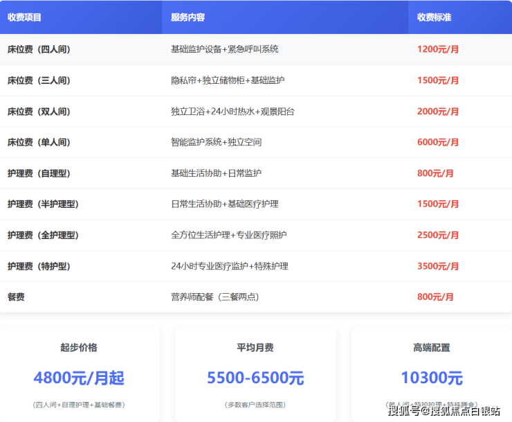 • 价格区间:根据护理等级和房型差异化定价,一般在4800-6000元/月范围内