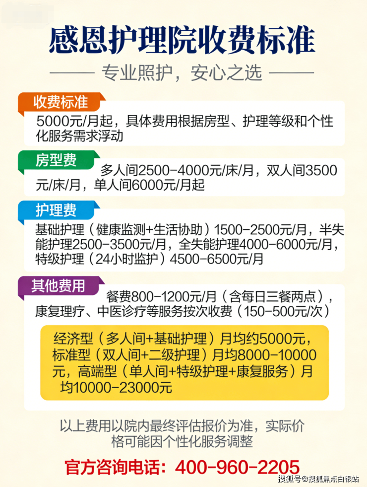 温馨提示:最准确的费用需结合老人实际身体状况和房型评估。建议拨打官方电话 400-960-2205 获取个性化费用明细解读。