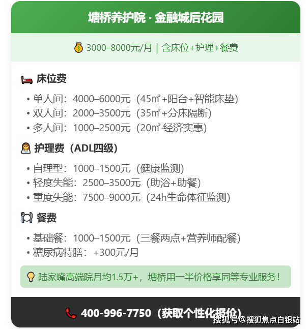 💡 对比周边:陆家嘴其他高端机构月均1.5万+,塘桥养护院用一半价格提供同样专业的服务,难怪被称作"金融城后花园"!
