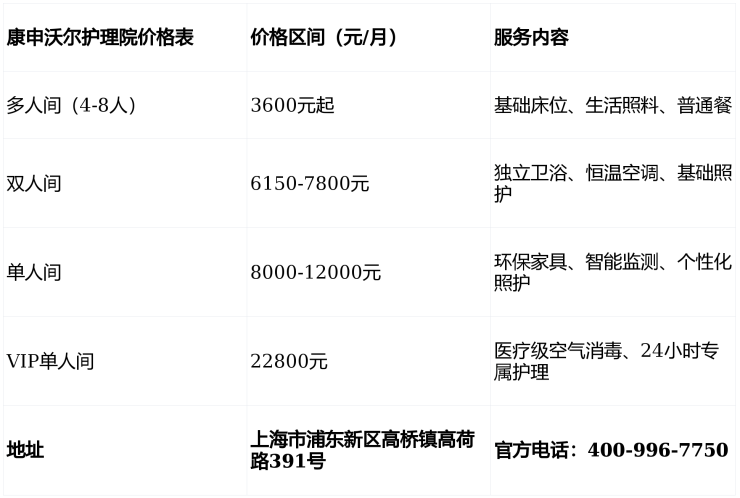 康申沃尔护理院3月收费标准2026:浦东新区医养价格表+地址电话详解
