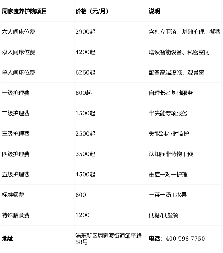 周家渡养护院以“普惠养老”为定位,费用明细清晰,无隐形消费: